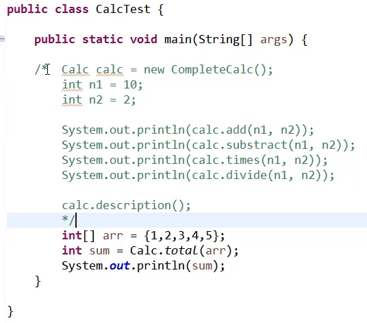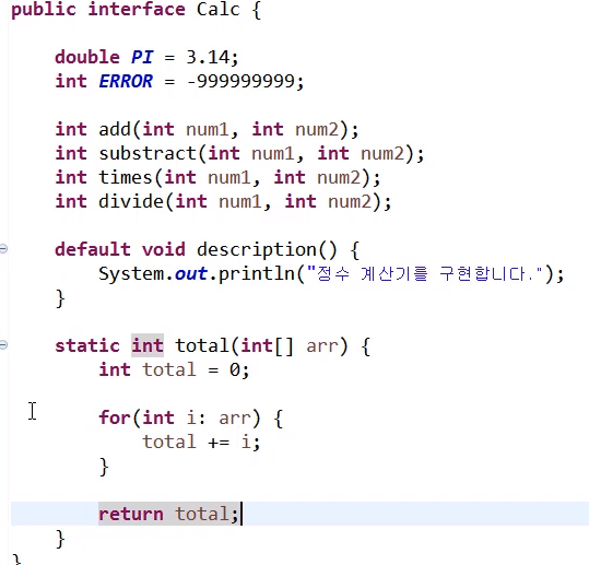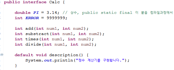 정적 메서드 : 인스턴스 생성과 상관없이 인터페이스 타입으로 호출하는 메서드 (java8)