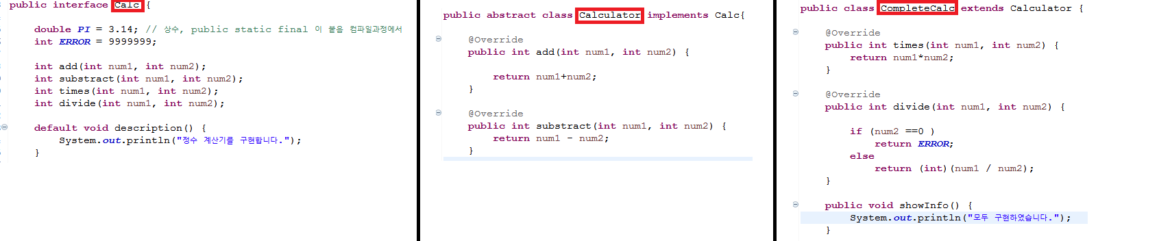 -인터페이스는 구현 코드가 없으므로 하나의 클래스가 여러 인터페이스를 구현 할 수 있다.