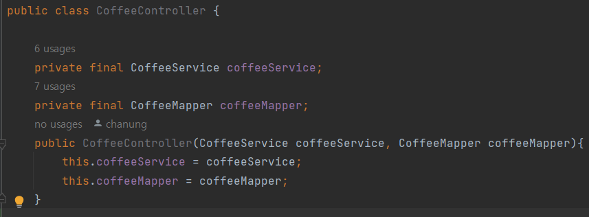 이제 API 계층인 컨트롤러 클래스에서는 CoffeeService 클래스를 직접 생성하는 것이 아닌 주입을 통하여 느슨해진 결합이 완성 되었다. 생성자를 통하여 매게변수로 서비스계층의 클래스가 주입이 자동으로 된다. (스프링부트의 기능)