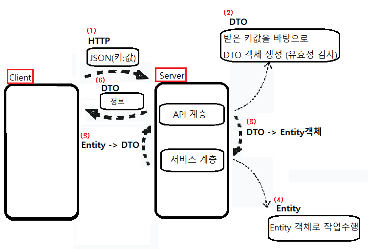 (5) 작업이 완료된 Entity 객체는 다시 클라이언트에게 리턴하기 위해 DTO 객체로 변환한다.