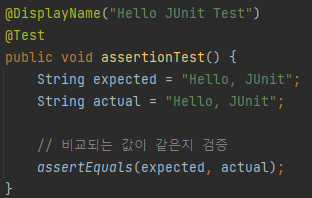 - JUnit 에서는 검증을 도와주는 Assertions를 import하면 검증을 쉽게 할 수 있다.
