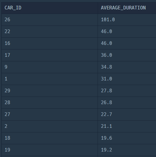 ORDER BY AVERAGE_DURATION DESC, CAR_ID DESC;