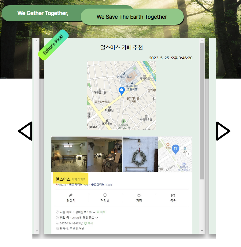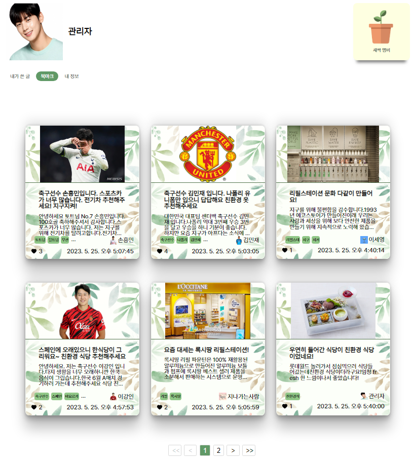 친환경에 관련된 음식점, 카페, 의류 등을 커뮤니티 게시판 형식으로 등록을 하며 사람들한테 알리며 자신만의 게시글 리스트를 관리할 수 있다. 또한 관리자는 도움이 될만한 게시글은 채택이 되어 메인 페이지에 고정이 될 수 있다.
