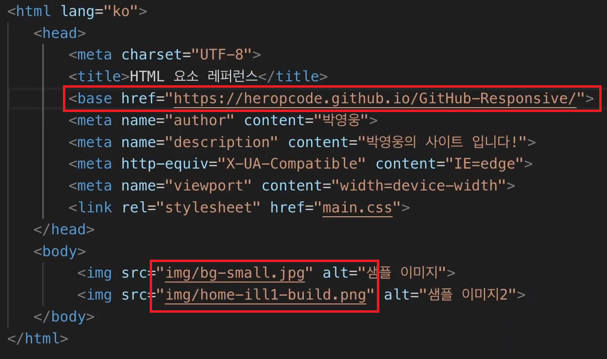 - BASE 요소는 문서에 포함된 모든 상대 URL 들의 기준 URL을 나타낸다.