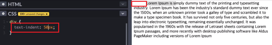 text-indent (첫번째 줄의) 들여쓰기를 지정 , 음수 값도 사용 가능(화면 옆으로 가서 화면에선 안보임 )