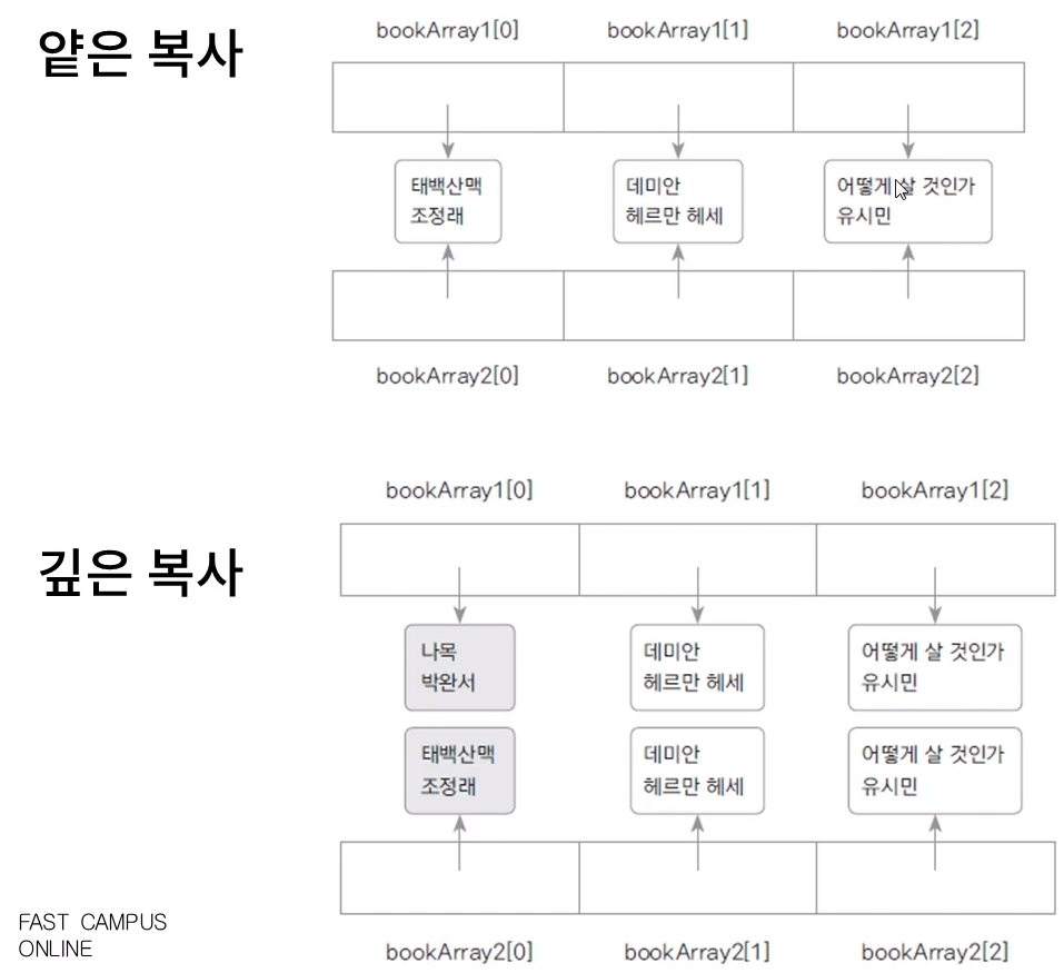 얕은 복사 (주소만 복사 = 똑같은 놈) , 깊은 복사