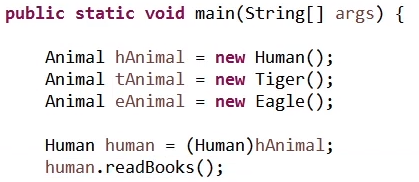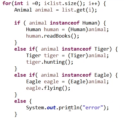 안정적으로 다운캐스팅 하귀 위해 if문에 instanceof 를 설정하고 오버라이딩을 사용하면 좋지만 예를 들면 독수리가 책을 읽는 메서드는 할수 없으니 따로 메서드를 쓰기 위해 다운캐스팅을 하여 메서드를 사용한다.